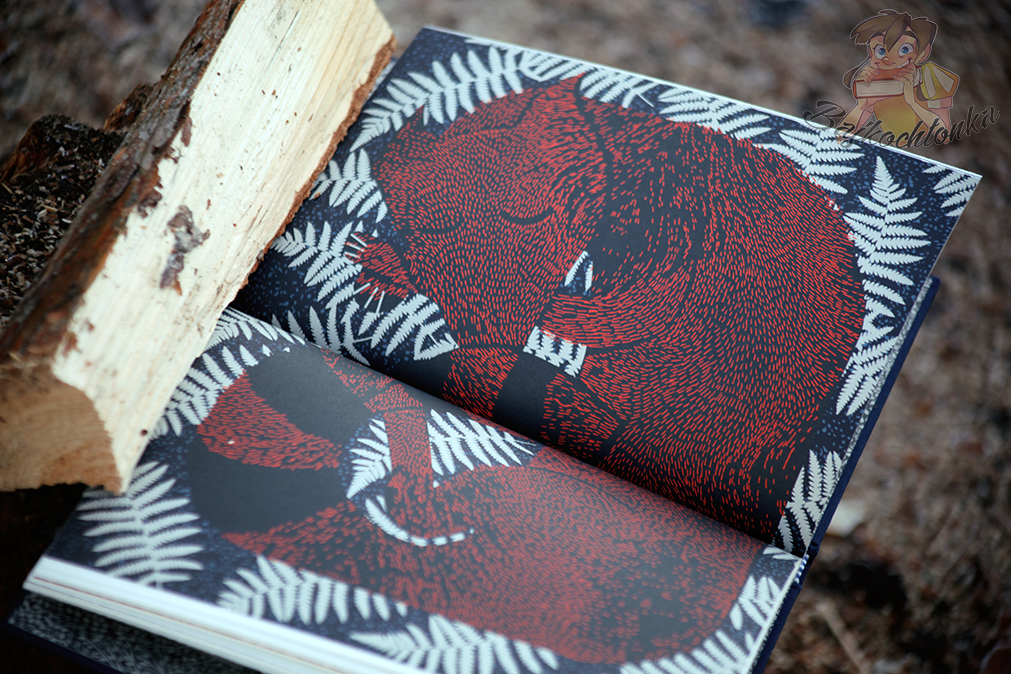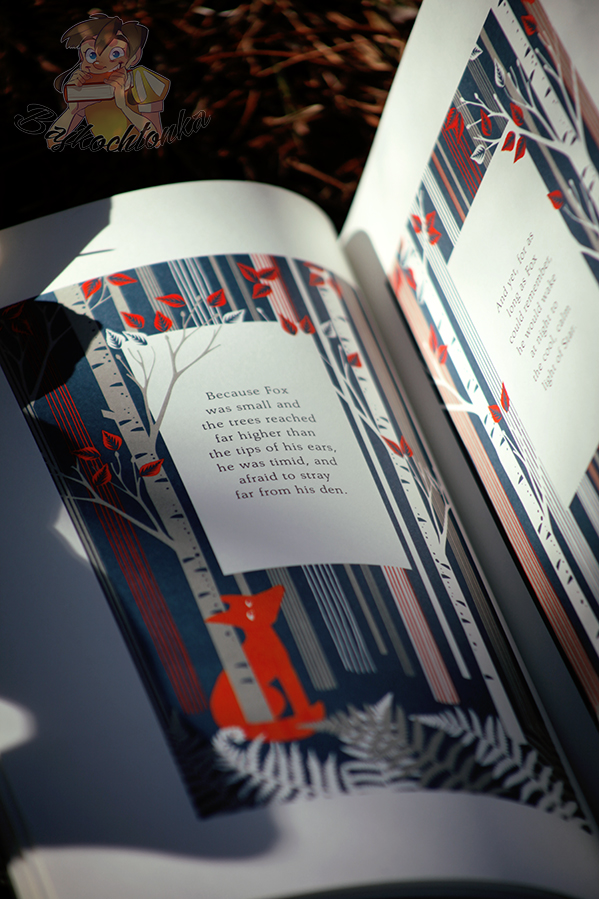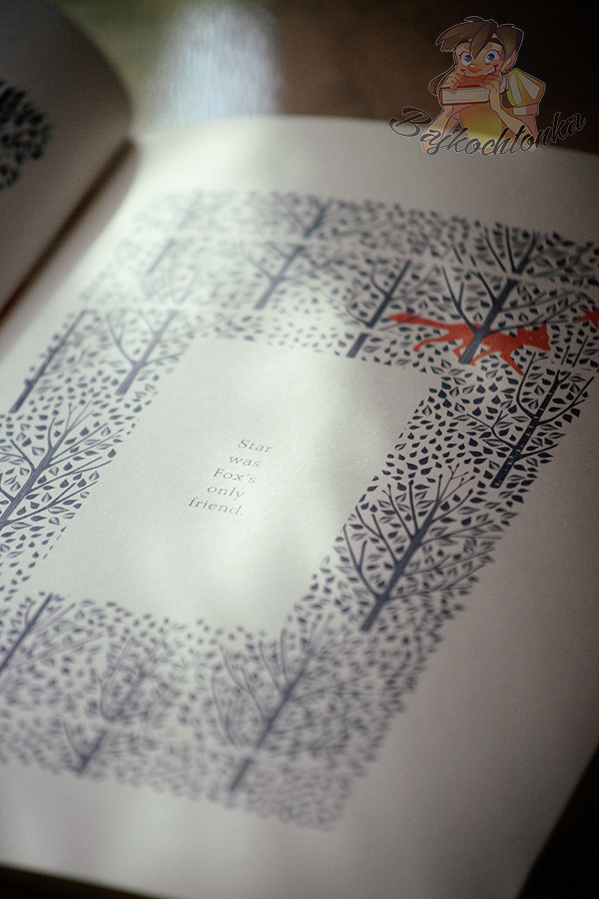 ,,The Fox and the Star” jest prezentem z mojego krótkiego wyjazdu do Londynu (zresztą na wspaniały spektakl ,,Matyldę” o którym opowiem Wam więcej już wkrótce). Przyciąga uwagę piękną okładką z granatowego płótna, a w środku zachwyca obrazami autorki oraz jednocześnie ilustratorki Coralie Bickford – Smith. Oprócz tego książka jest szyta, nie klejona. Strony nie mają standardowej numeracji, co rzeczywiście jest zbędne, bo pochłania się ją w całości, ,,na raz”.