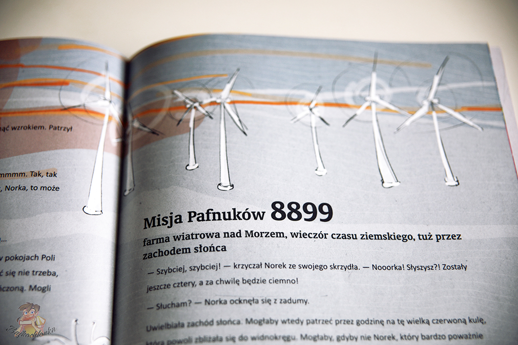W pierwszej części poznajemy ich pierwsze misje, chociaż numery zadań (np. ,,Misja Pafnuków 6879) oraz określenie miejsca i czasu akcji, przypomina nieco teczkę z zadaniami dla filmowego superagenta. Tuż obok Norka i Norki możemy bliżej przyjrzeć się kilkorga dzieciom, którym udaje się poznać Pafnuki. One same nie są mistrzami w ukrywaniu się. Co więcej, mam nawet wrażenie, że celowo dają się przyłapać, żeby móc opowiedzieć swoją historię ludziom.