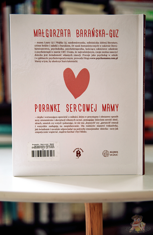 Książkę ,,Poranki sercowej mamy” zamówiłam w księgarni internetowej, bo zwróciła moją uwagę tytułem i okładką. Jej autorką jest Małgorzata Barańska-Guz – dr nauk humanistycznych, psycholożka i psychoterapeutka. Jej opowieść to historia o pewnej mamie, która miała wielkie łóżko w kształcie serca i każdego dnia kładła w nim spać swoje dzieci.