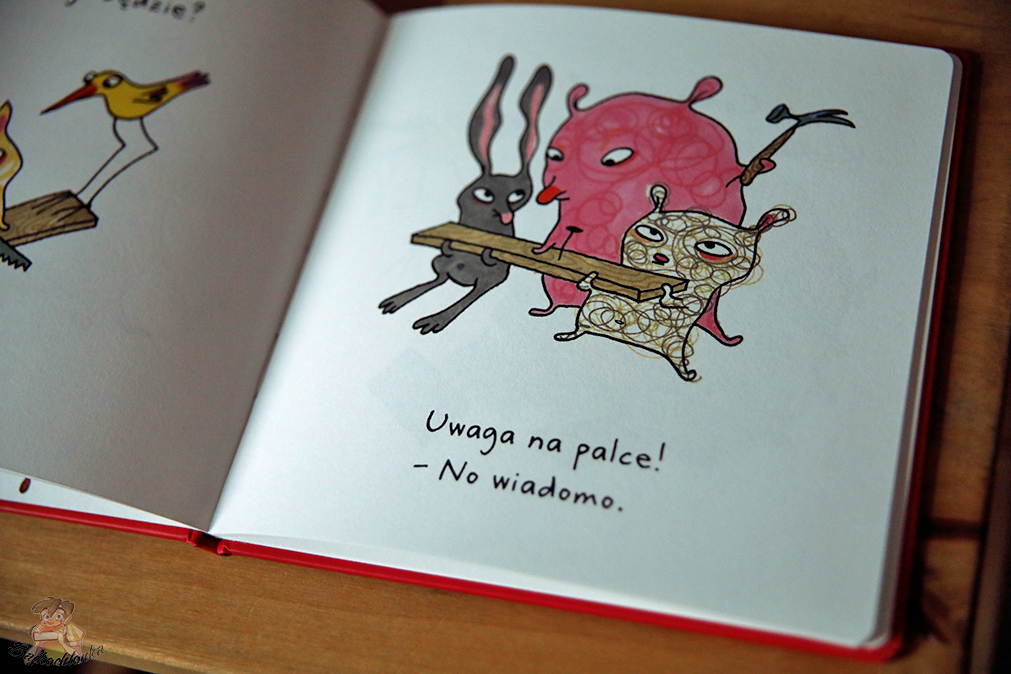 Na koniec pozostawiłam opowieść z największą liczbą bohaterów! Biorą w niej udział znane już z poprzednich części – Kocio, Ptaszyna, Królik, Miświnka i Miśka. Razem coś zawzięcie budują i choć starają się uważać… to i tak co rusz dochodzi do jakiegoś wypadku. Jest krew i są łzy, mimo to nie przestają pracować, a efekt… przechodzi najśmielsze oczekiwania!