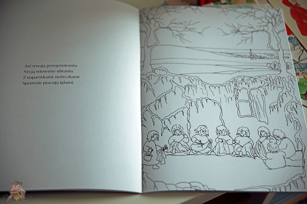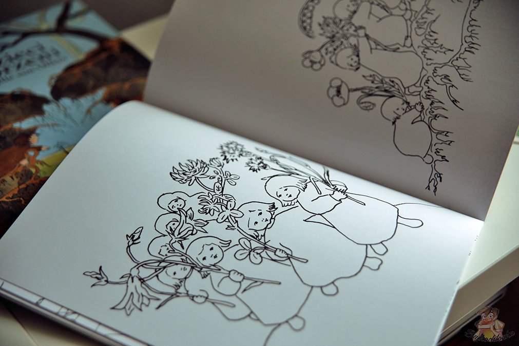 Gdyby jednak ktoś miał ochotę na własną interpretację tej bajki, może sięgnąć po ,,Wszystkie kolory dzieci korzeni”. To kolorowanka z wybranymi ilustracjami z książki oraz fragmentami tekstu (tylko ona jest w miękkiej okładce). Po lekturze ,,Dzieci korzeni” można z powodzeniem oddać się miłemu zajęciu kolorowania.