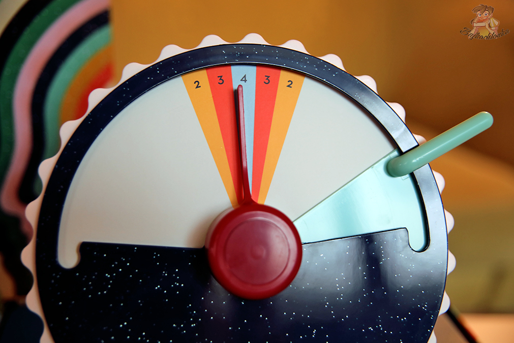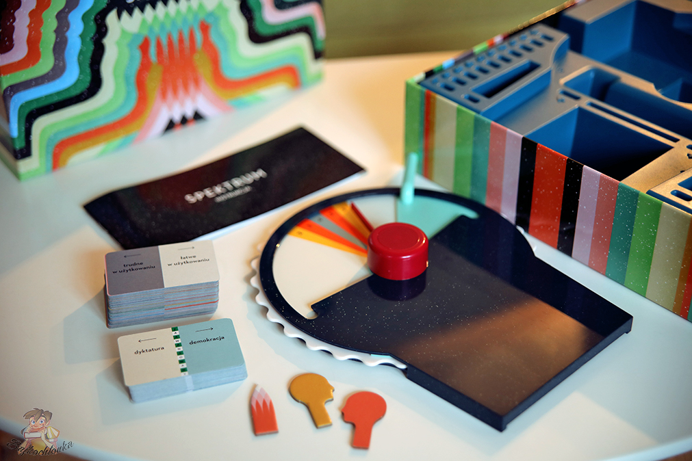 Rozgrywka składa się z trzech faz – podpowiadacza (choć ja nazwałabym ją po prostu fazą hasła), fazy aktywnej drużyny (czyli fazy zgadywania) oraz fazy wyboru strony (trafniej – fazy przeciwników). W dużym skrócie – w ,,Spektrum” losuje się kartę, np. taką z napisem: dobry przykład – zły przykład. Podpowiadacz w tajemnicy przed innymi wprowadza koło w ruch i widzi, gdzie na półkolu znajduje się liczba 4 (czyli ta, która oferuje najwięcej punktów). Jego zadaniem jest teraz wymyślić takie słowo, które pozwoli drużynie poprawnie oszacować to miejsce. Jeżeli ,,czwórka” znalazłaby się dokładnie w połowie półokręgu, wtedy mógłby użyć np. słowa: starsza siostra, bo jest ono idealnie pasujące do tych dwóch przykładów (jeżeli punkty byłyby po lewej stronie, mógłby powiedzieć: prymus, a po prawej – kryminalista).