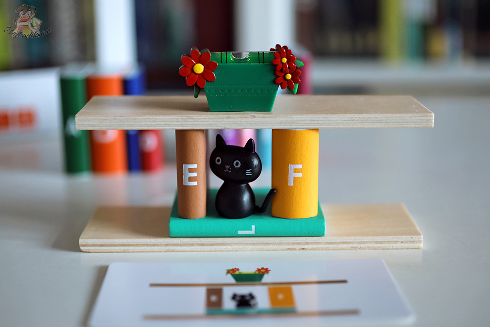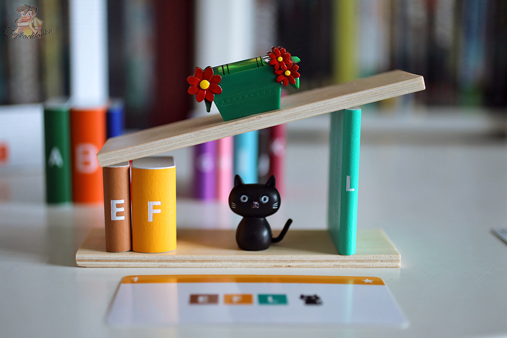 Układając książki, które wskazuje wybrana lub wylosowana karta zadań, trzeba pamiętać, że mają one tworzyć linię prostą (po to jest ta poziomnica). Kot z kolei powinien znajdować się przyjemniej między dwoma książkami.