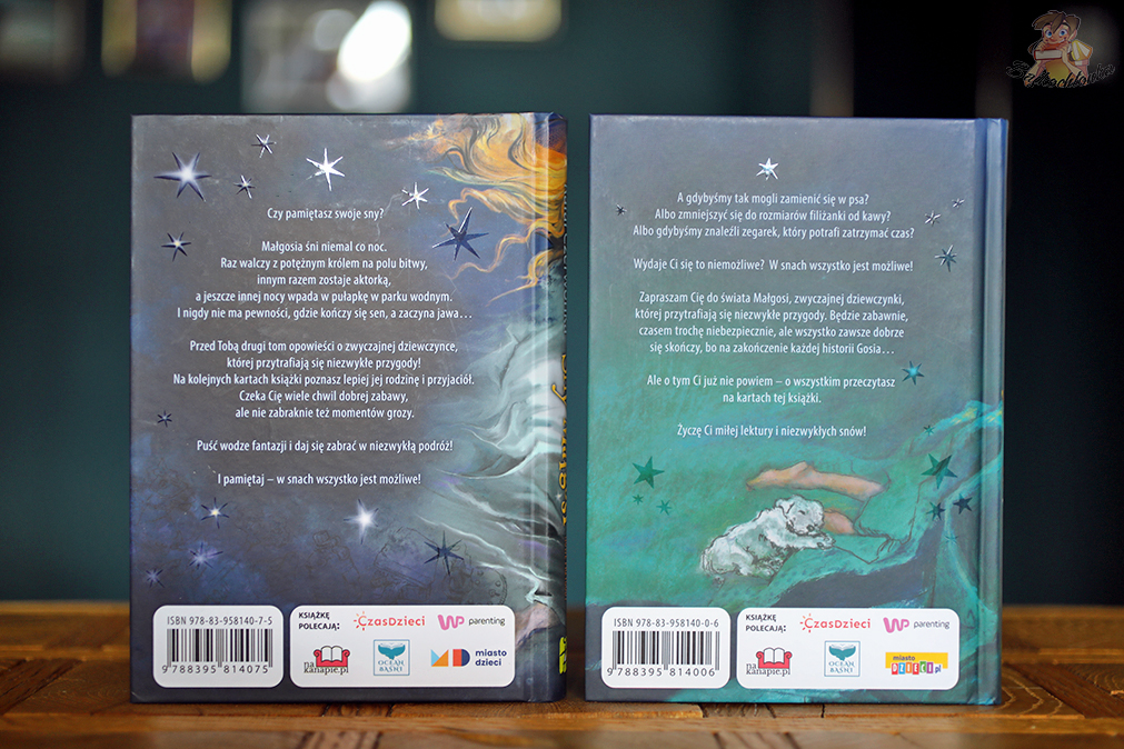 Sny Małgosi oraz Sny Małgosi. Nowe przygody mają przyjemny, mały i poręczny format. Nie rekomendowałabym ich raczej bardzo małym dzieciom. To lektura dla nieco już mocniej świadomego odbiorcy, najlepiej takiego powyżej 9 roku życia. Książki nie tylko zabiorą dzieci w fajną, literacką podróż, ale także pozwolą zastanowić się nad ważnymi zagadnieniami – obecnością smartfonów w naszym życiu, odpowiedzialnym podróżowaniem, relacjami z innymi czy empatią.