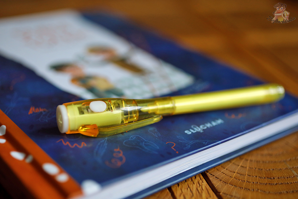 Do każdego egzemplarza Duduś i Tolek na tropie dołączany jest długopis z latarką UV. Po włączeniu niebieskiego światła, pojawiają się dodatkowe treści widoczne już nawet na okładce!