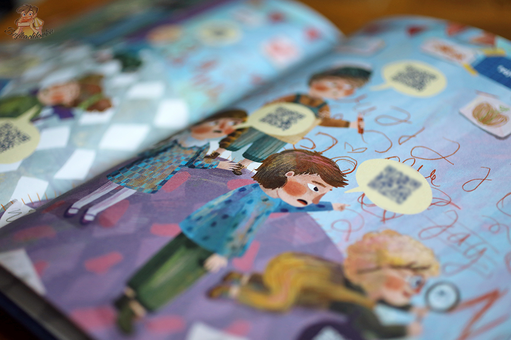 Ten doskonały patent dla młodych odkrywców przypomina mi inną książkę ilustratorki – Piotruś Nieustraszony. Bardzo się cieszę, że to rozwiązanie znalazło jeszcze jedno, kreatywne zastosowanie. Zagadki, ale i dodatkowe aktywności, które zapisano niewidocznym tuszem, to dobry sposób, żeby zaangażować małych czytelników na dłużej.