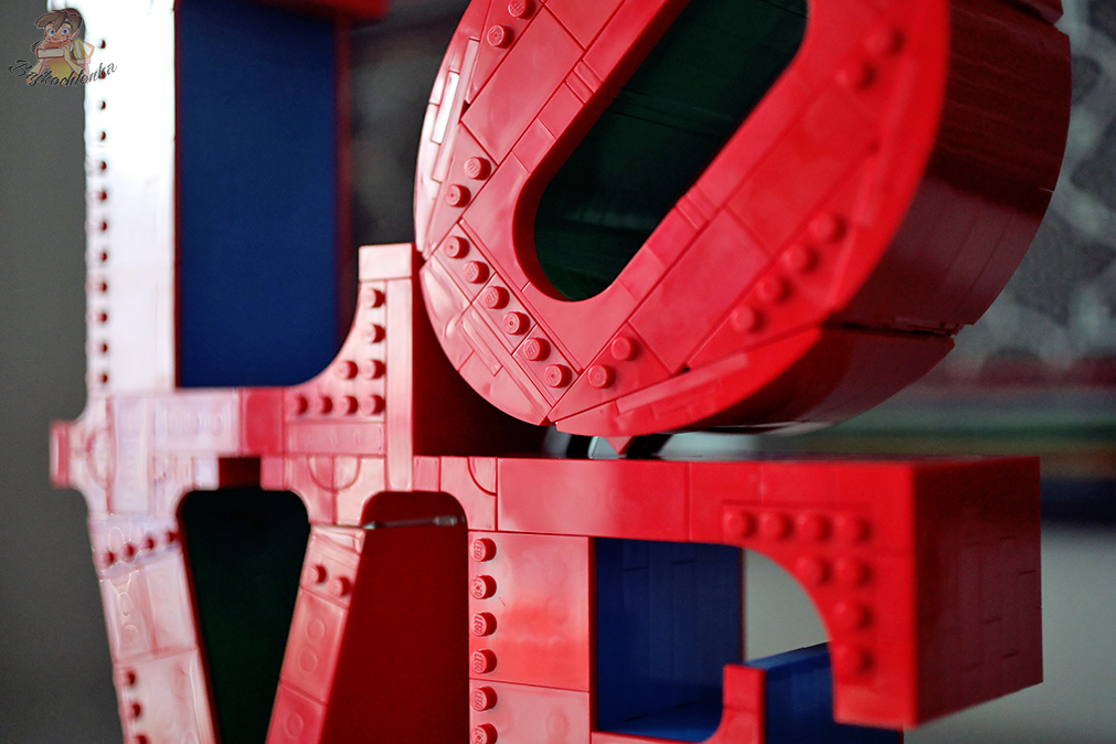 Finalnie napis prezentuje się bardzo ciekawie. Charakteryzuje się 25 cm wysokości i szerokości oraz 6 cm głębokości. Ta kolorystyka zastosowana przez Roberta Indianę sprawdza się również w rzeźbie z klocków.