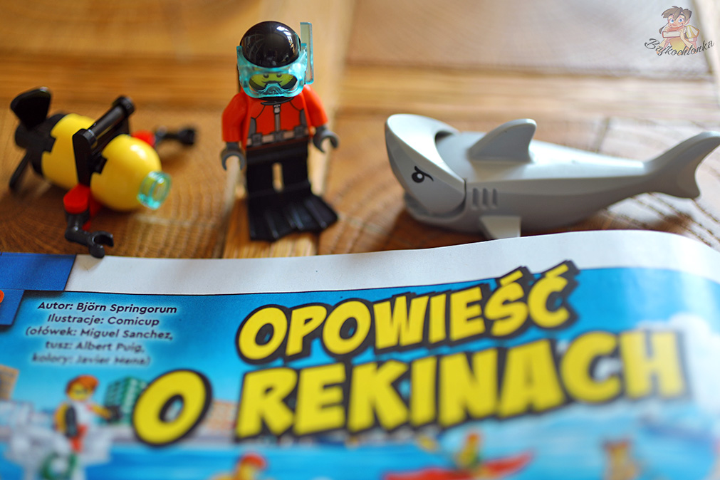 W swoich domach możecie teraz odegrać sceny tej historii, za sprawą dołączonej do magazynu zabawki. Do złożenia jest minifigurka Bartka z butlą tlenową, rekin, a także mały model nurkującego robota.