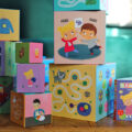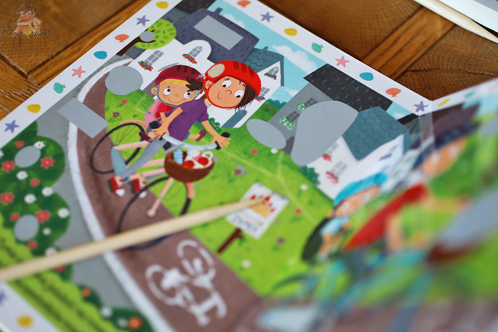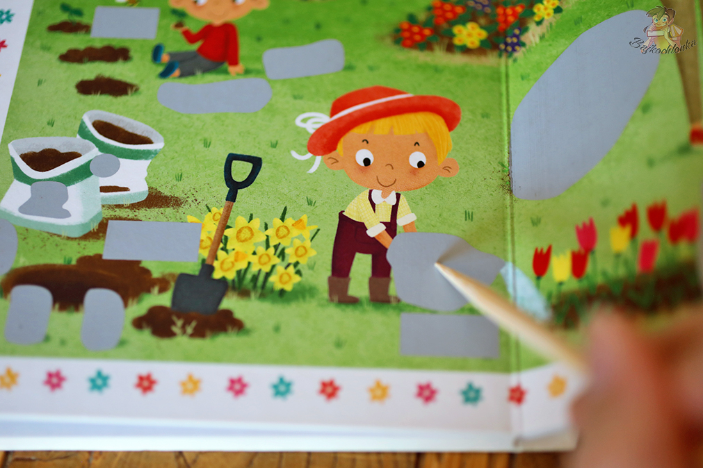 Do każdej kartonówki dołączony został patyczek. My jednak za bardzo go nie wykorzystaliśmy – zdecydowaliśmy się na użycie zwykłej monety. Zdrapywanie warstwy srebrnej farby z rozkładówek przynosi masę frajdy, ale to również dobre, manualne ćwiczenie.