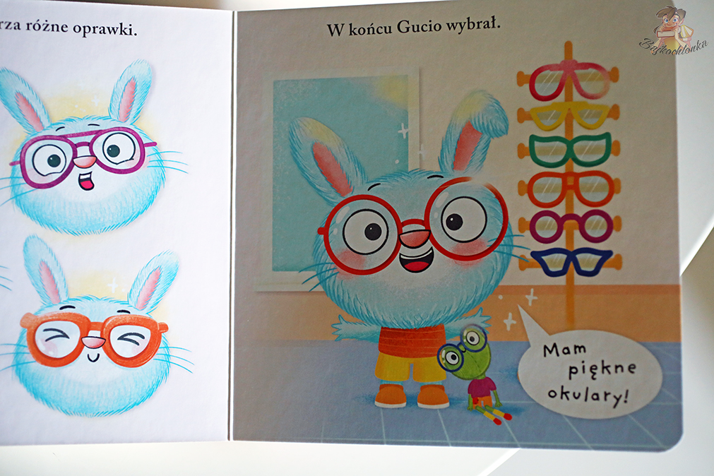 Książeczka To ja, Gucio. Okulary będzie z kolei nieoceniona dla tych dzieci, które muszą nosić okulary. Pokazuje odbiorcom przebieg wizyty u okulisty, a następnie proces wybierania odpowiednich oprawek.
