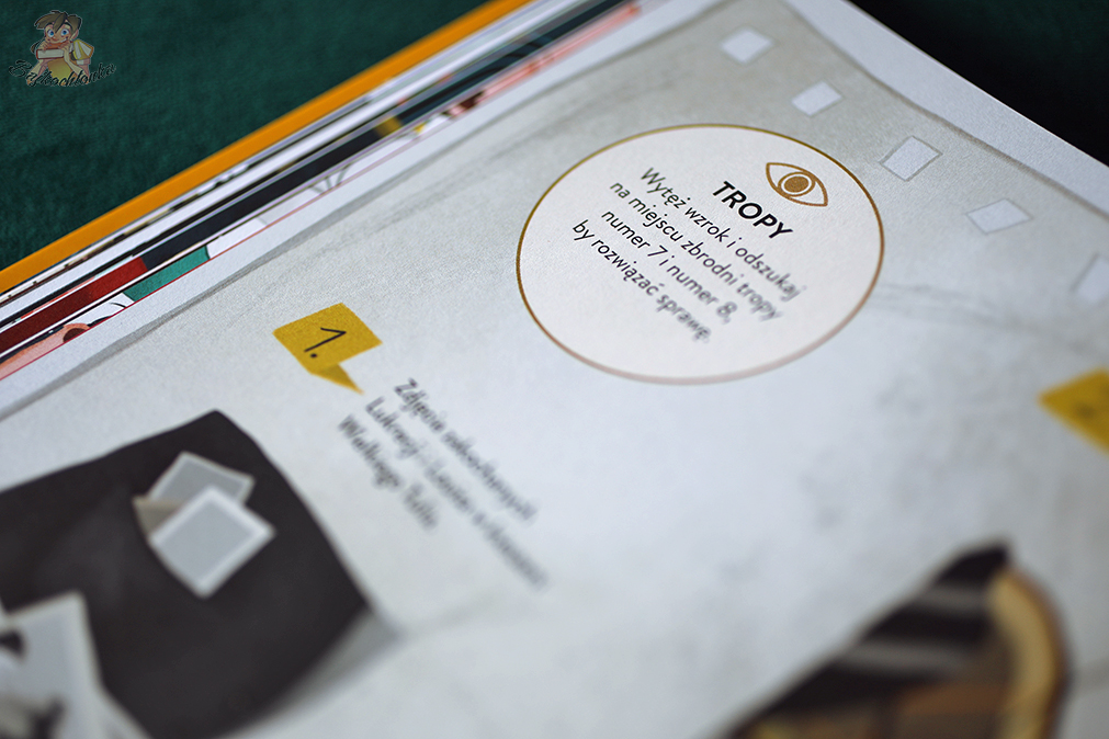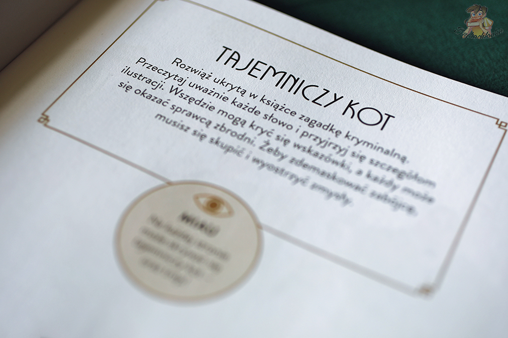 Czytelnik ma szansę odpowiednio przyjrzeć się miejscom akcji, dostrzegając rozmaite poszlaki prowadzące do rozwiązania. Na każdej rozkładówce znajduje się także czarny kot – zabawę w jego odszukiwanie można uznać za dobrą rozgrzewkę przed zadaniem głównym.