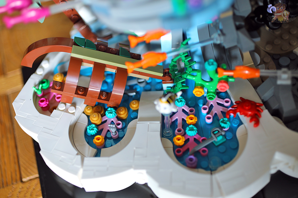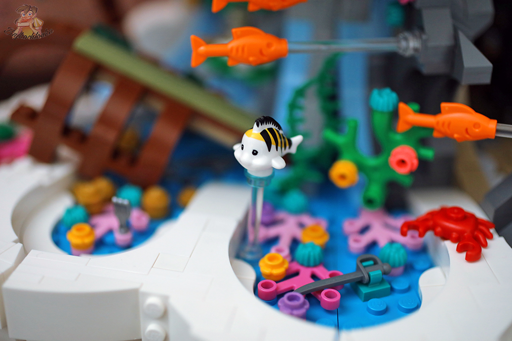 W związku z tym, że ma ona sporo sekcji: zakątek z wrakiem statku oraz rozsypanymi wokół akcesoriami, jaskinię Ursuli z wyposażeniem, fragment rafy koralowej z tronem Arielki oraz w końcu centralny punkt z Trytonem – co chwilę zaskakuje czymś nowym.