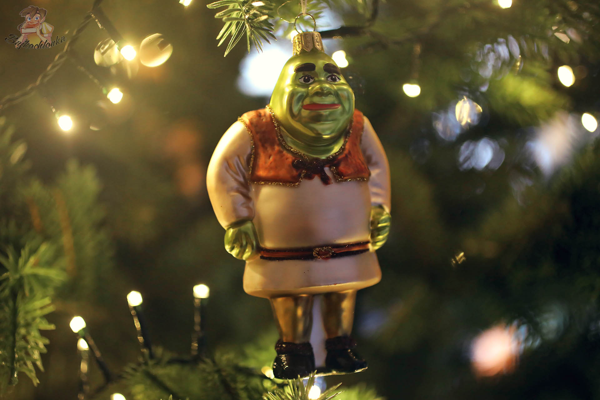 - Bombka Shrek – zielony ogr z charakterystycznym, dobrodusznym uśmiechem, w kremowej tunice i kamizelce. To jedna z tych ozdób, które natychmiast przyciągają wzrok dzieci.
