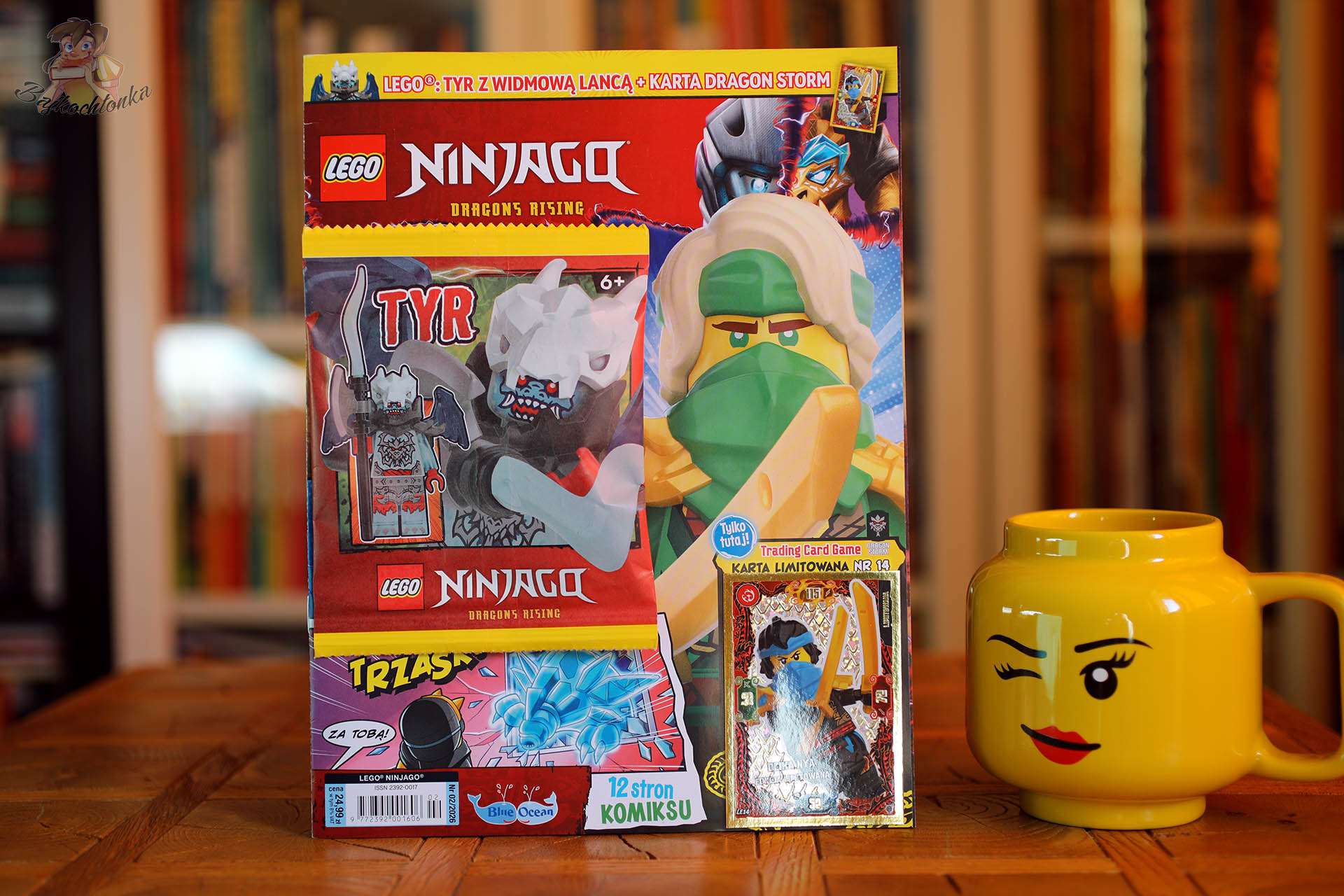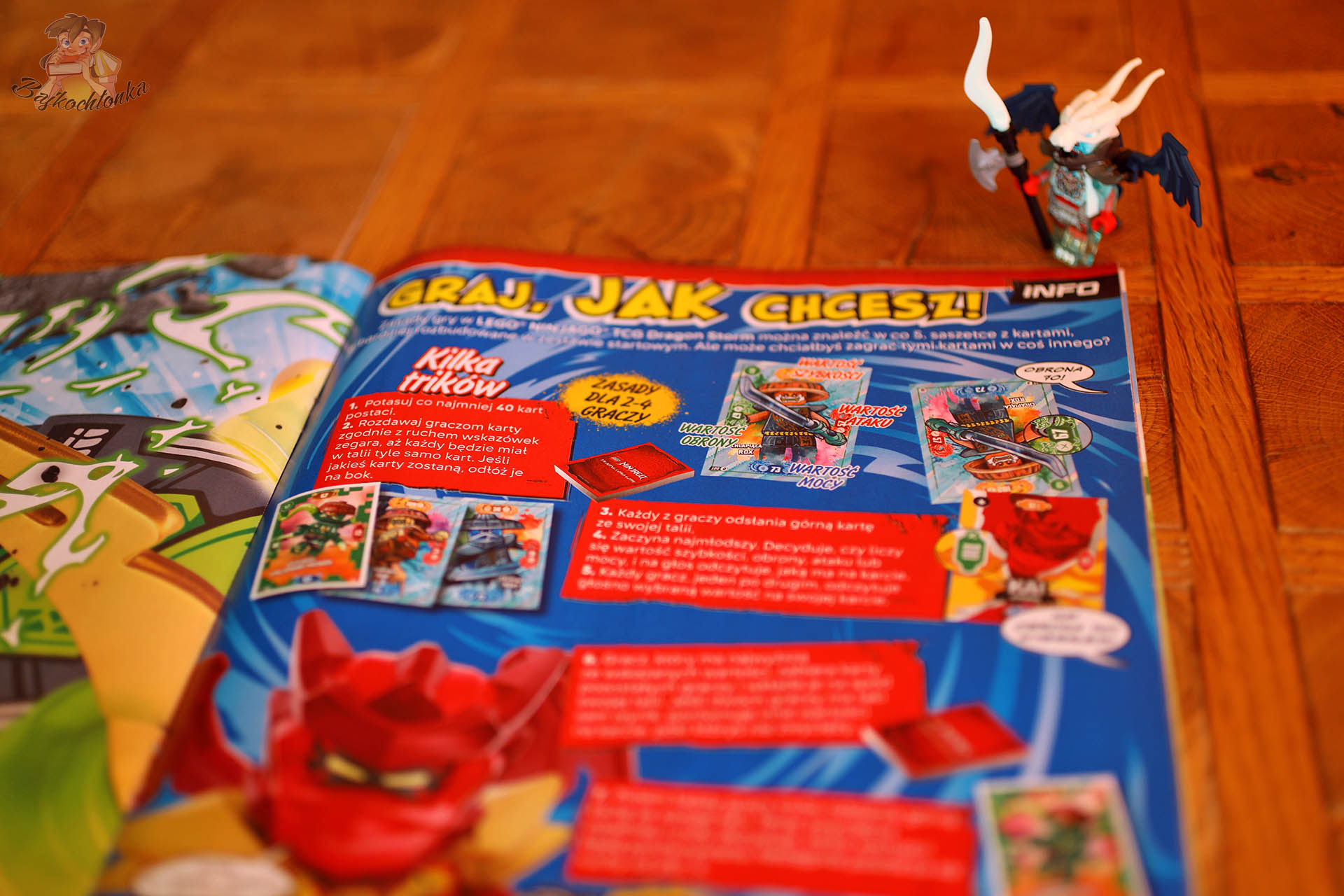 Bohaterem tytułu jest z kolei Tyr – przedstawiająca go minifigurka, została wyposażona w świetny, transparentny kostium, masywne skrzydła, broń oraz mistyczną smoczą czaszkę. W środku magazynu znajdziecie oczywiście komiks, sporo zadań aktywizujących i bardzo ciekawą stronę z z alternatywnymi zasadami do LEGO NINJAGO TCG Dragon Storm.
