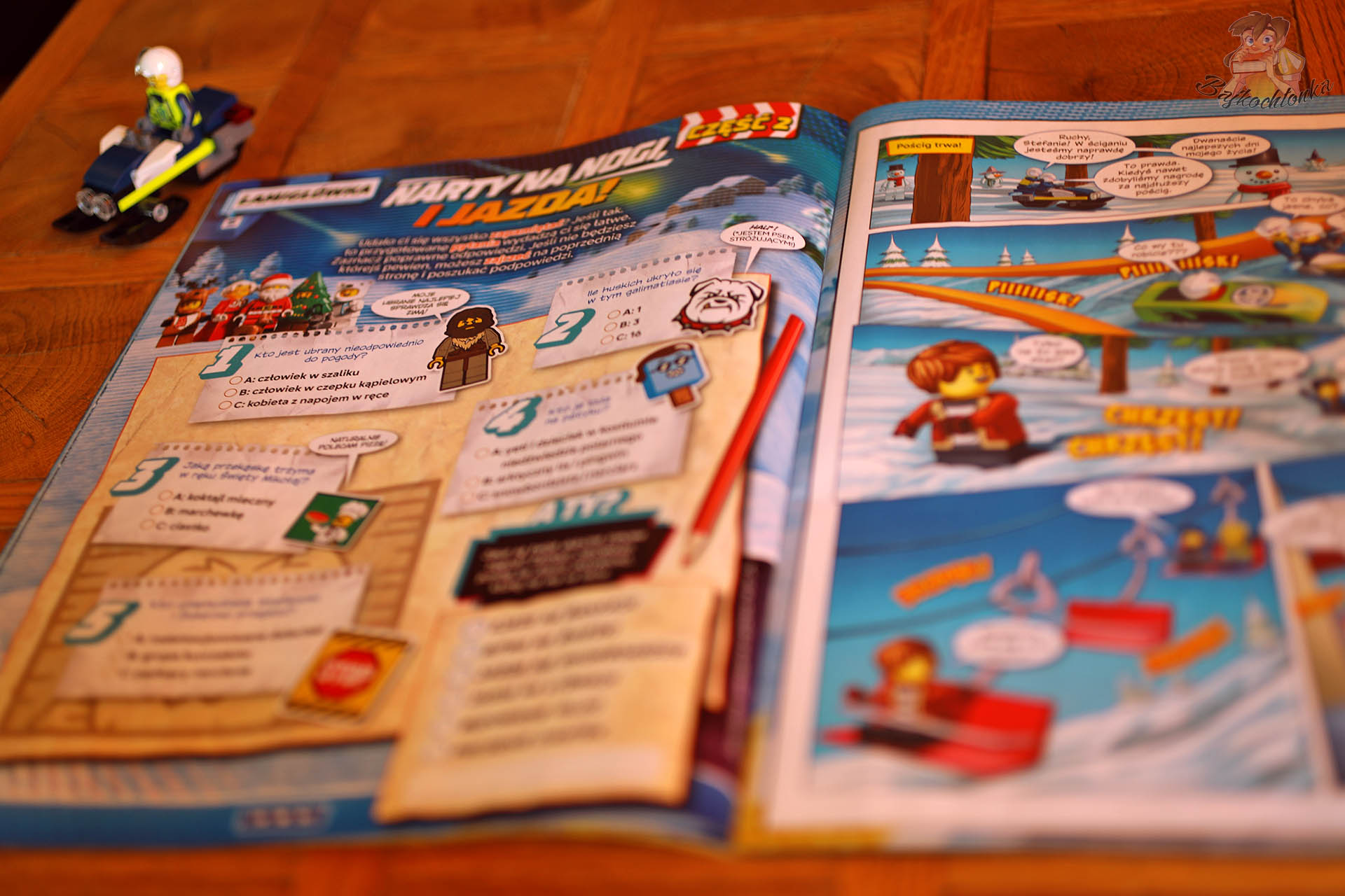 Na koniec została nam już tylko… mroźna przygoda w mieście LEGO! Zanim jednak w nią wyruszymy, warto złożyć zabawkę dołączoną do najnowszego numeru LEGO City, czyli policyjny skuter śnieżny Stefana Ślizgacza – wraz z jego minifigurką. Dzięki temu będzie nam raźniej śledzić perypetie bohaterów z tematycznego komiksu, ale również brać udział w rozmaitych łamigłówkach, labiryntach czy zadaniach ćwiczących pamięć.
