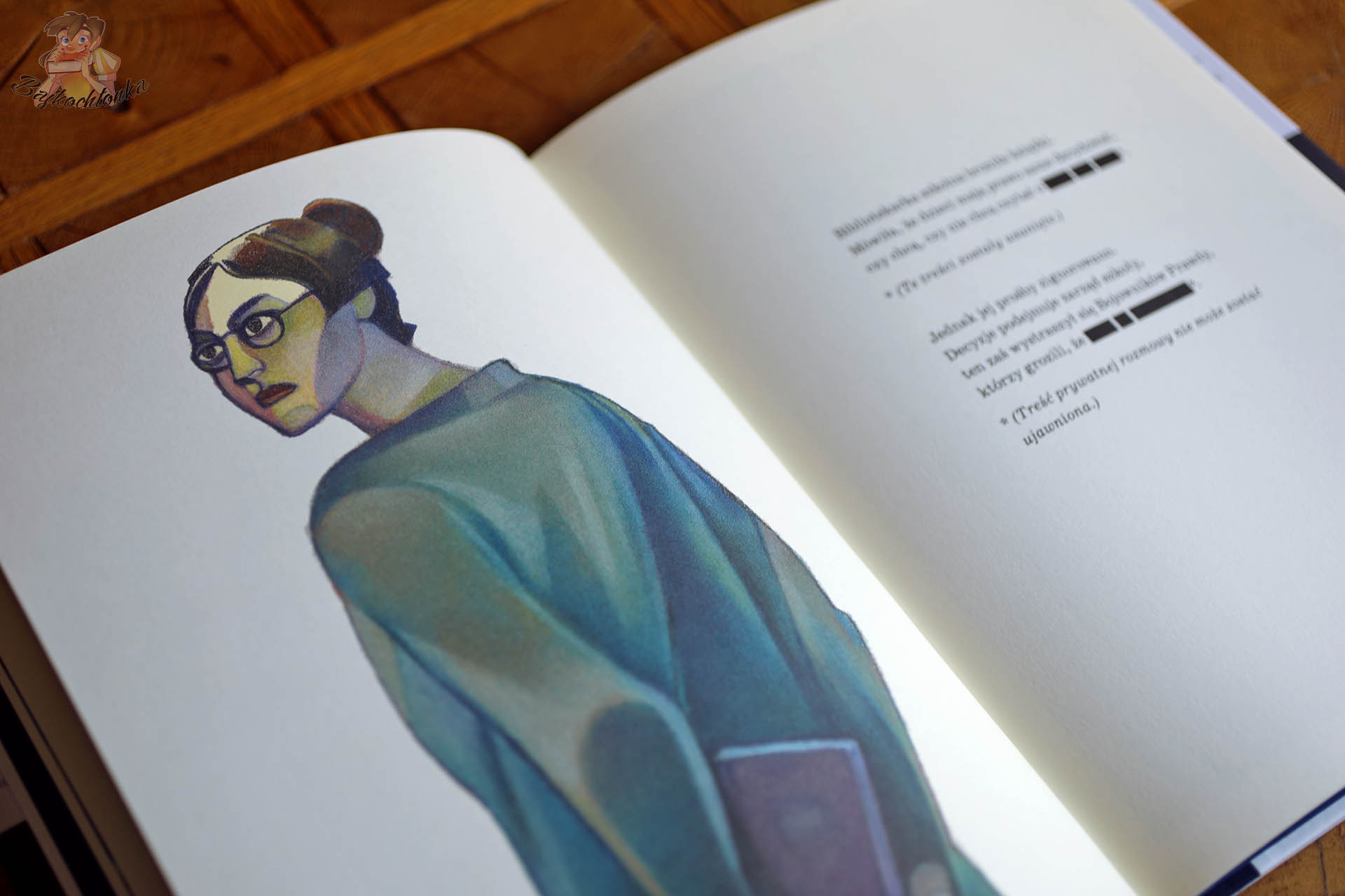 Nieco mroczne, ale zarazem malarskie ilustracje Gary’ego Kelleya wzmacniają przekaz, a ukryty pod owijką płócienny grzbiet oraz ilustracja chłopaka dodaje Zakazanej książce dodatkowe znaczenia i jeszcze większą wartość. Polecam tę lekturę czytelnikom powyżej 8 lat. Spróbujcie zrobić sobie ćwiczenie i uzupełnijcie zamazane przez cenzorów słowa. Jestem bardzo ciekawa jaki efekt otrzymacie.