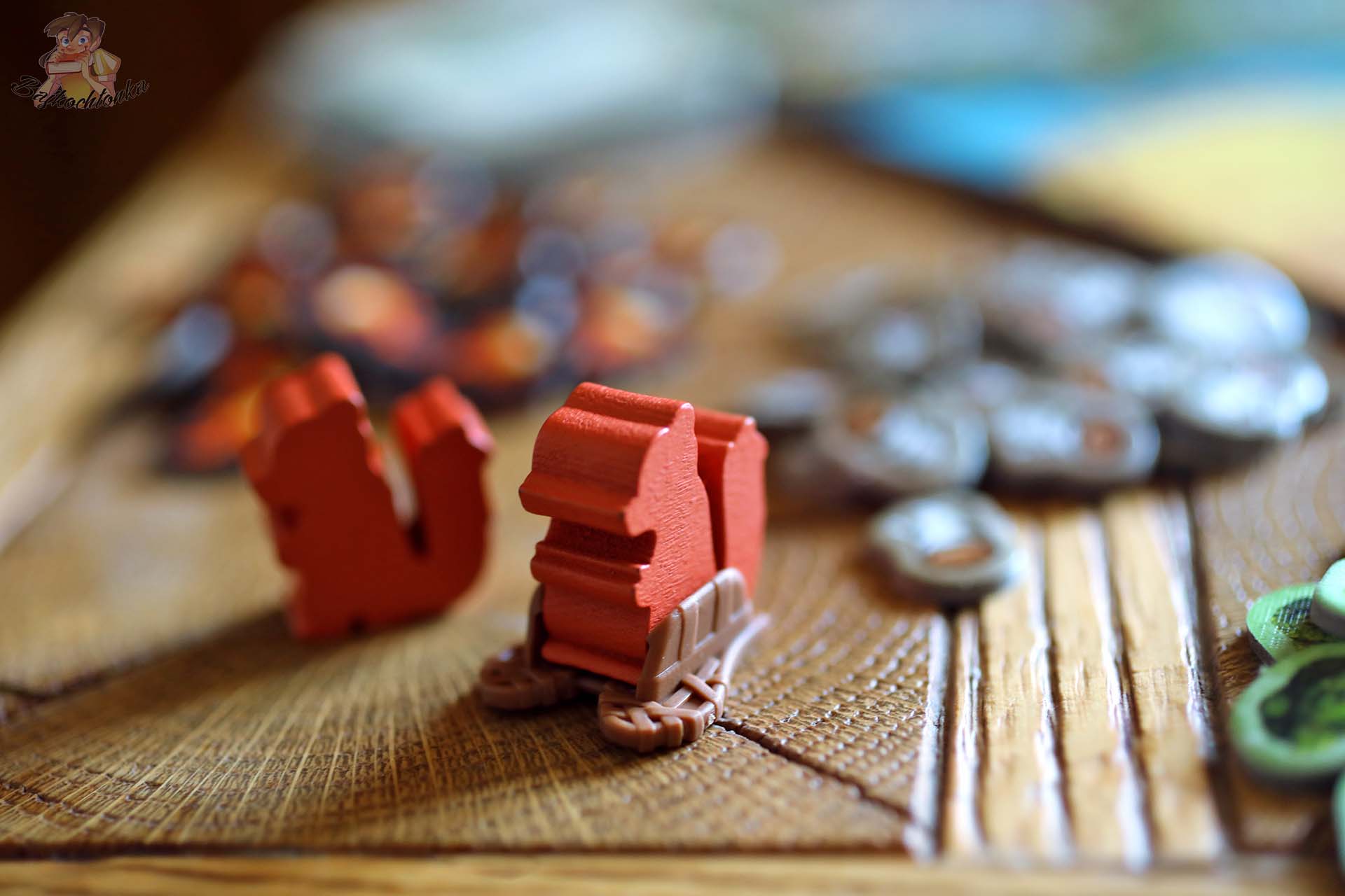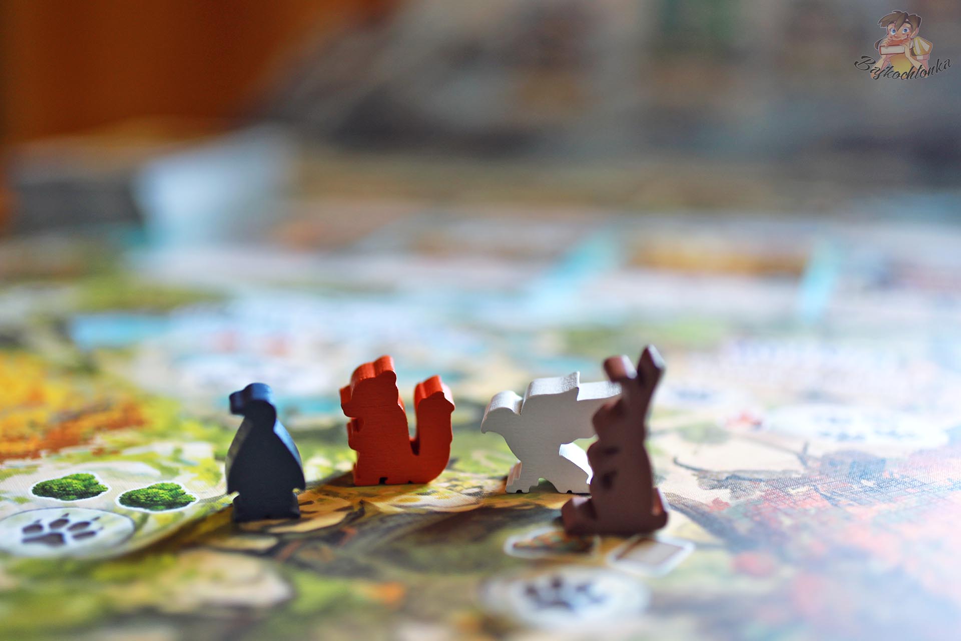 24 karty burzy śnieżnej będą wskazywać Wam w których miejscach należy położyć żetony śniegu, a drewniane pionki robotników (pand (wyglądających trochę jak wiewiórki), pingwinów, zajęcy oraz sokołów) z czterema podstawkami nart śnieżnych do założenia (świetny pomysł!), przyniesie Wam sporo radości.