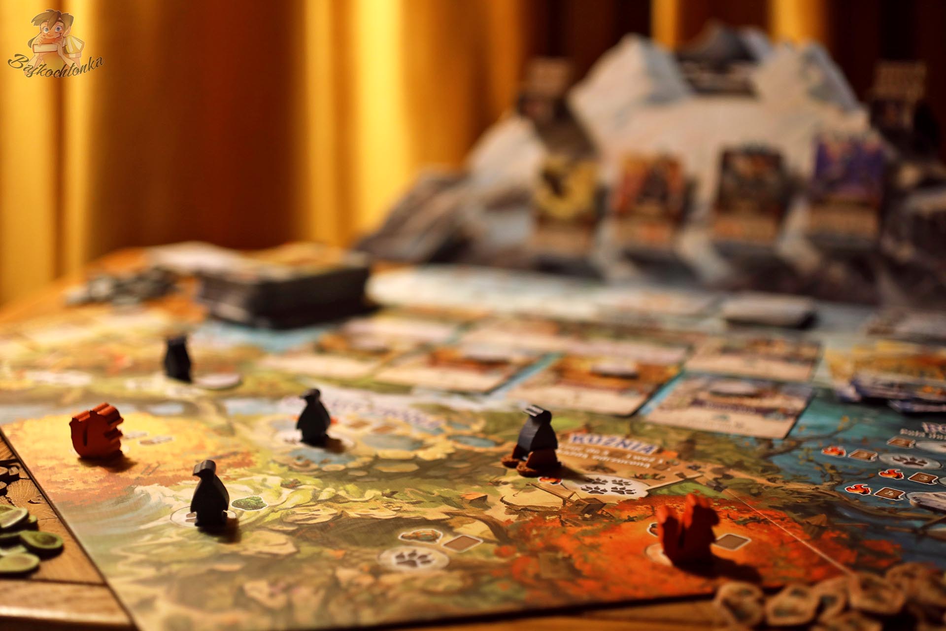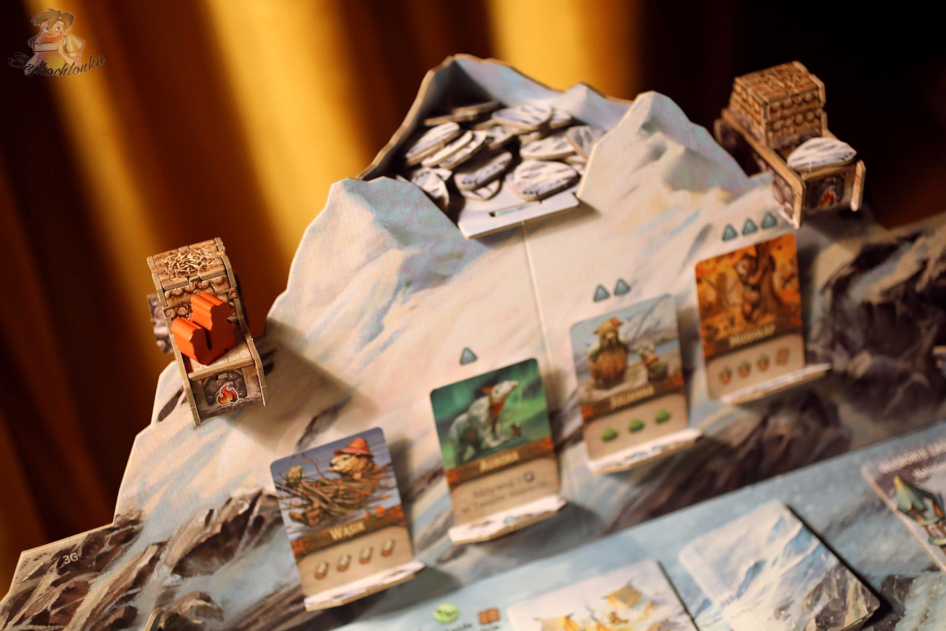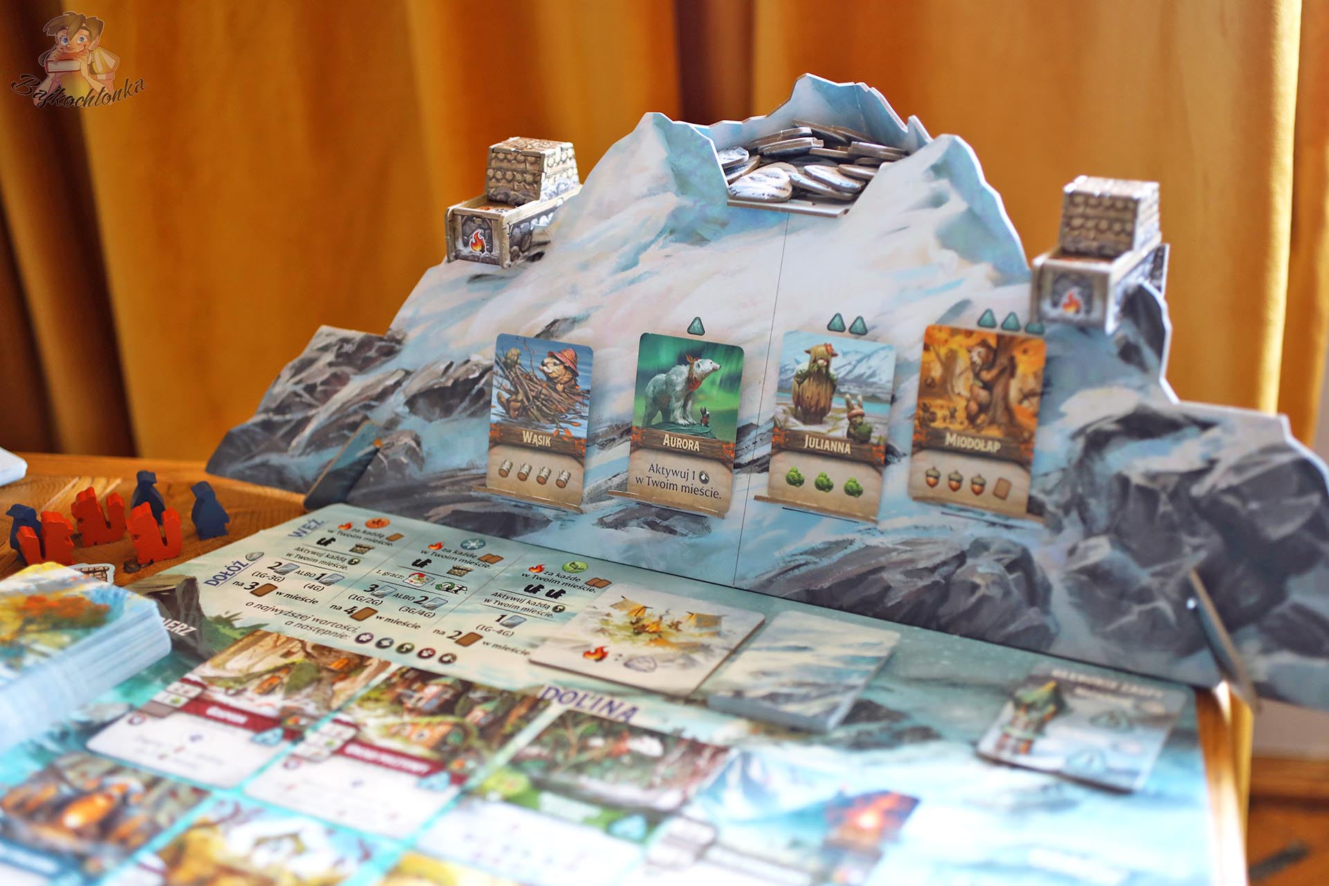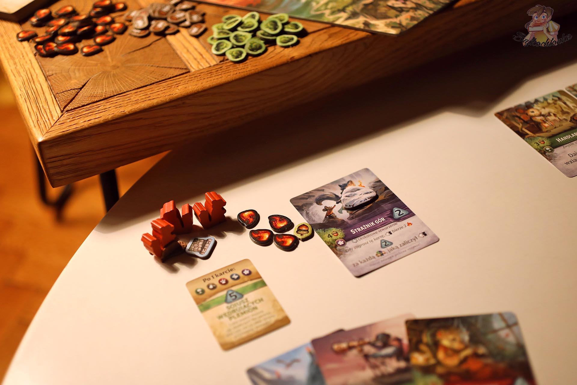 Karty dużych stworzeń znajdują się na zboczu góry. Ich bohaterowie mogą powiększyć naszą pulę punktów oraz zaoferować nam rozmaite, jednorazowe profity. Co ciekawe, w pudełku znajdziecie również mniejszą planszetkę góry, jeżeli chcecie, żeby Wasza rozgrywka była bardziej kompaktowa (nie jestem fanką tego rozwiązania 😉 Zdecydowanie warto złożyć swoją dużą górę, bo wygląda ona fenomenalnie).