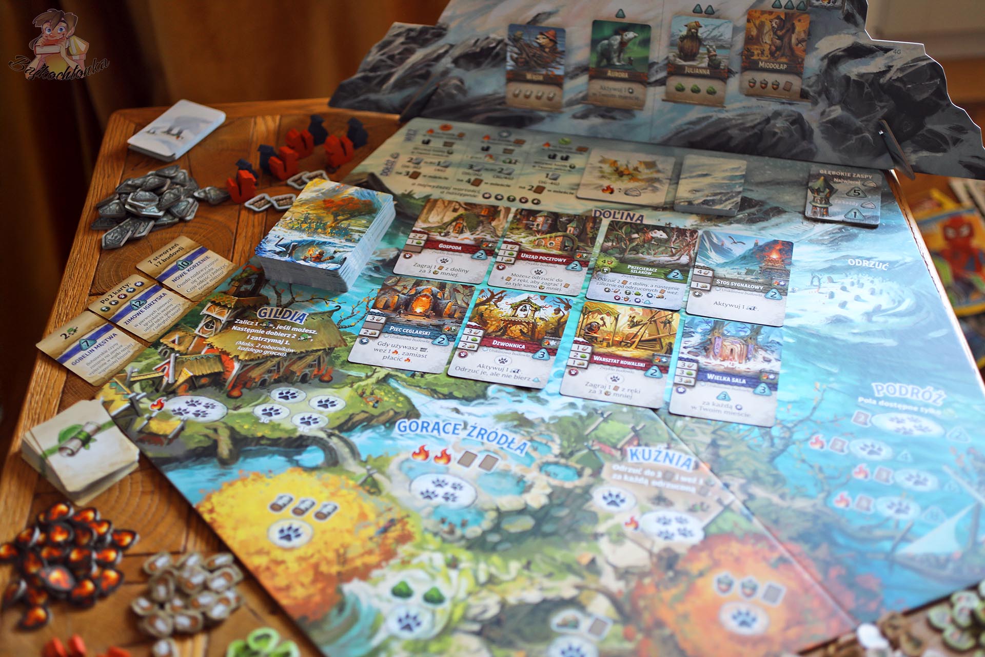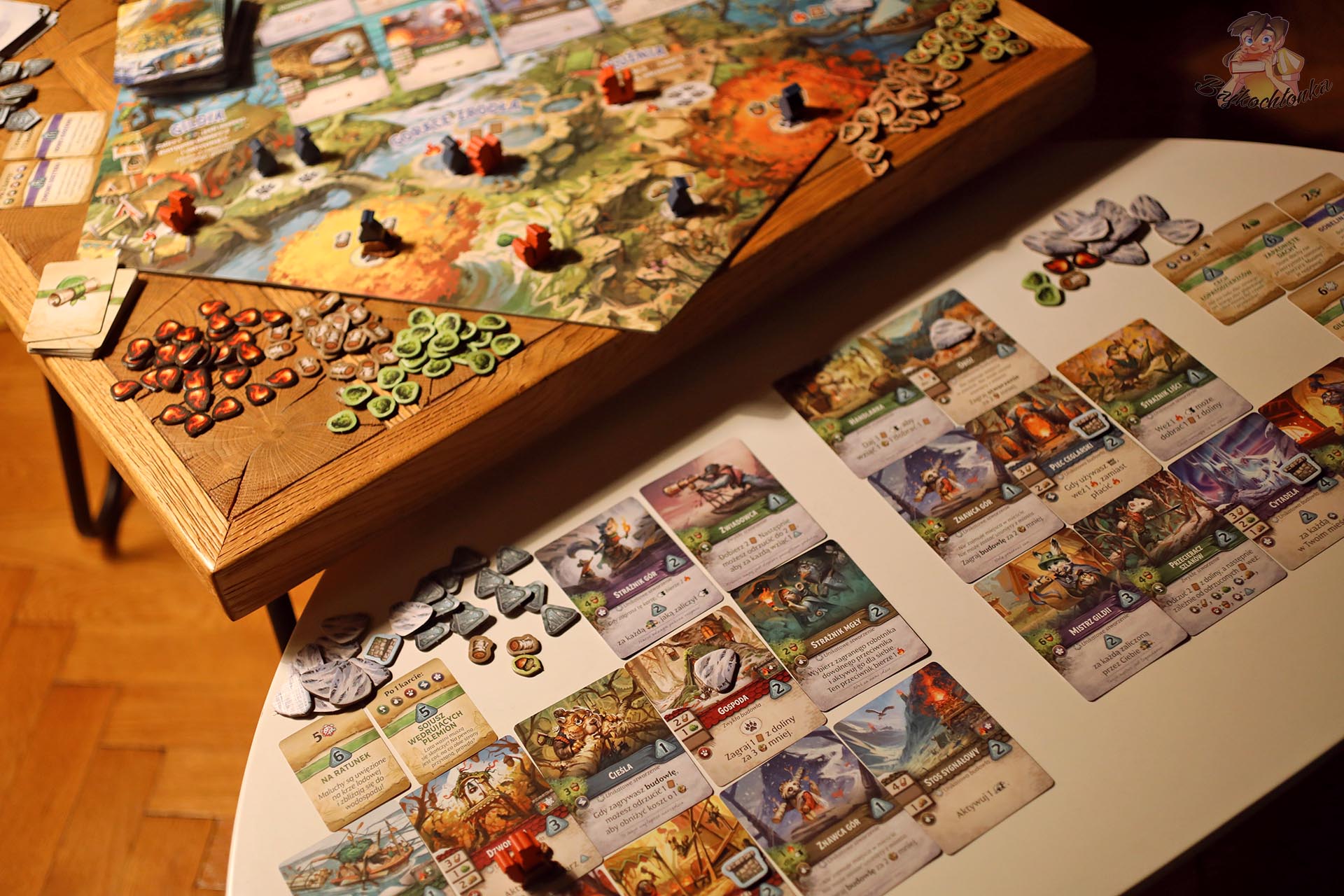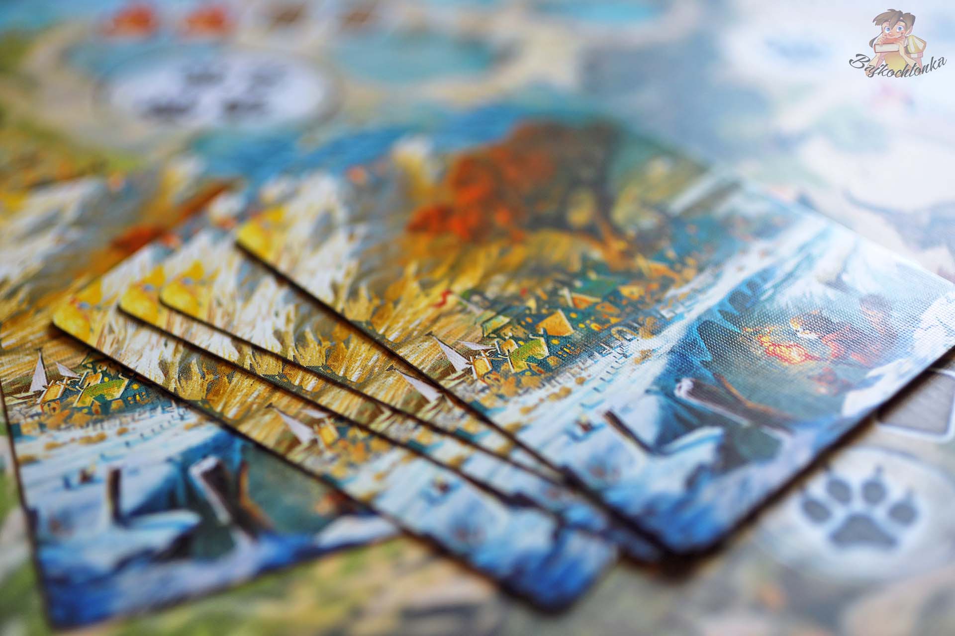 Planszówka składa się także na pięknie wydaną planszę z zaznaczoną Dolinką, Gildią (wprowadzającą również nowe mechaniki), miejscami do poboru zasobów oraz małą legendą z porami roku czy podpowiedziami. W pudełku znajdziecie także aż 123 karty talii, 27 kart dużych stworzeń, 28 kart nizinnych i 14 kart misji wyżynnych pozwalających gromadzić punkty oraz będących główną osią misji.