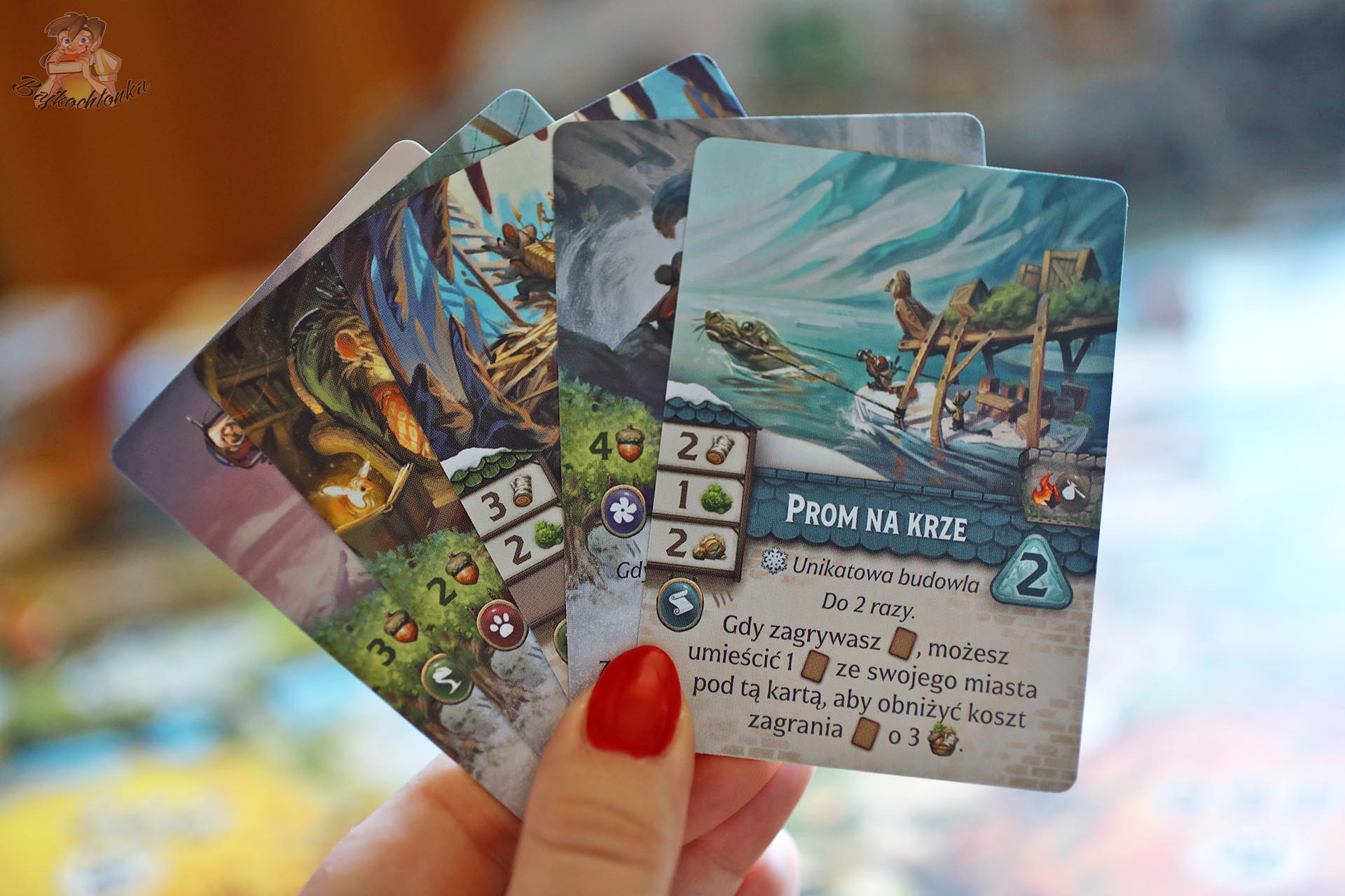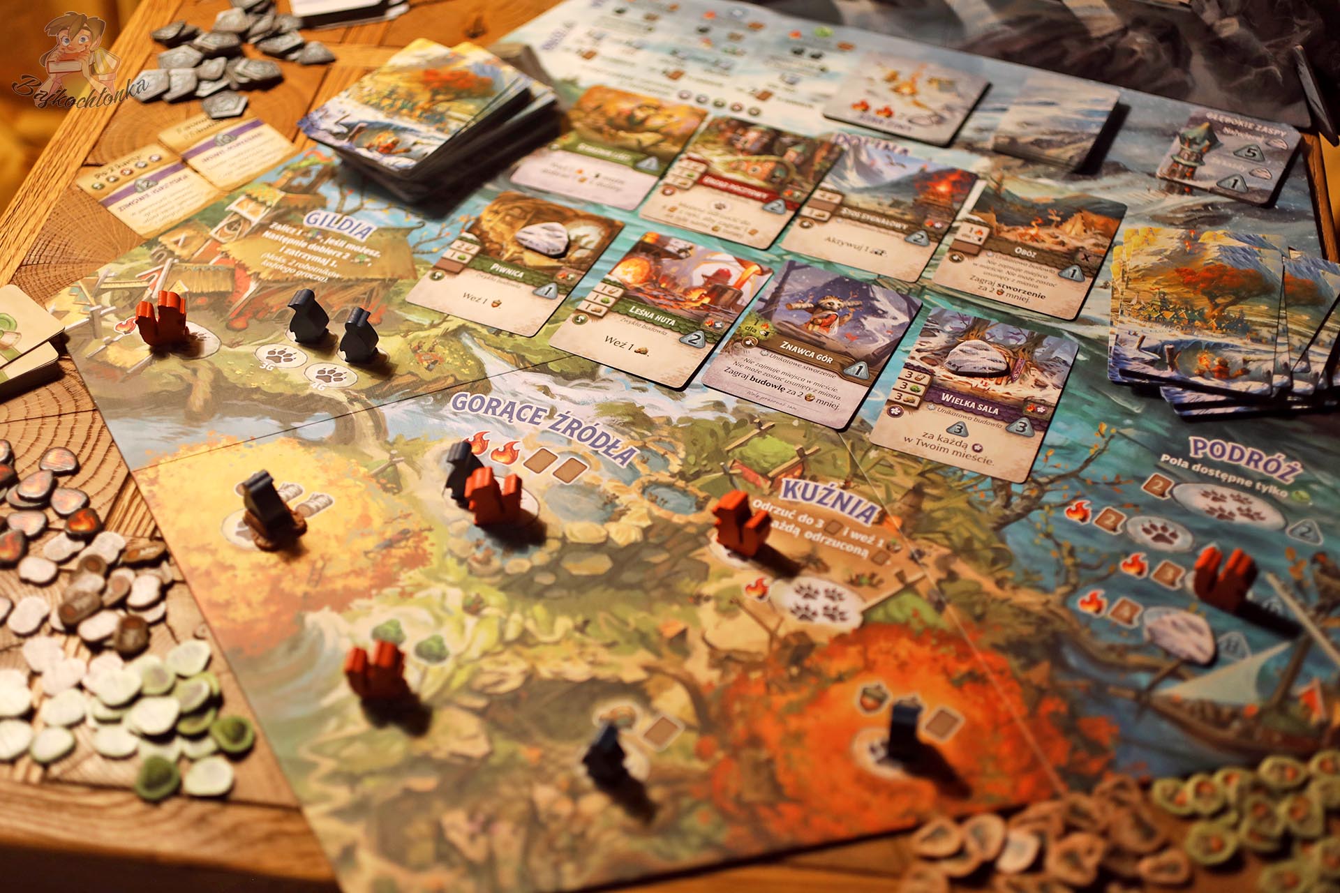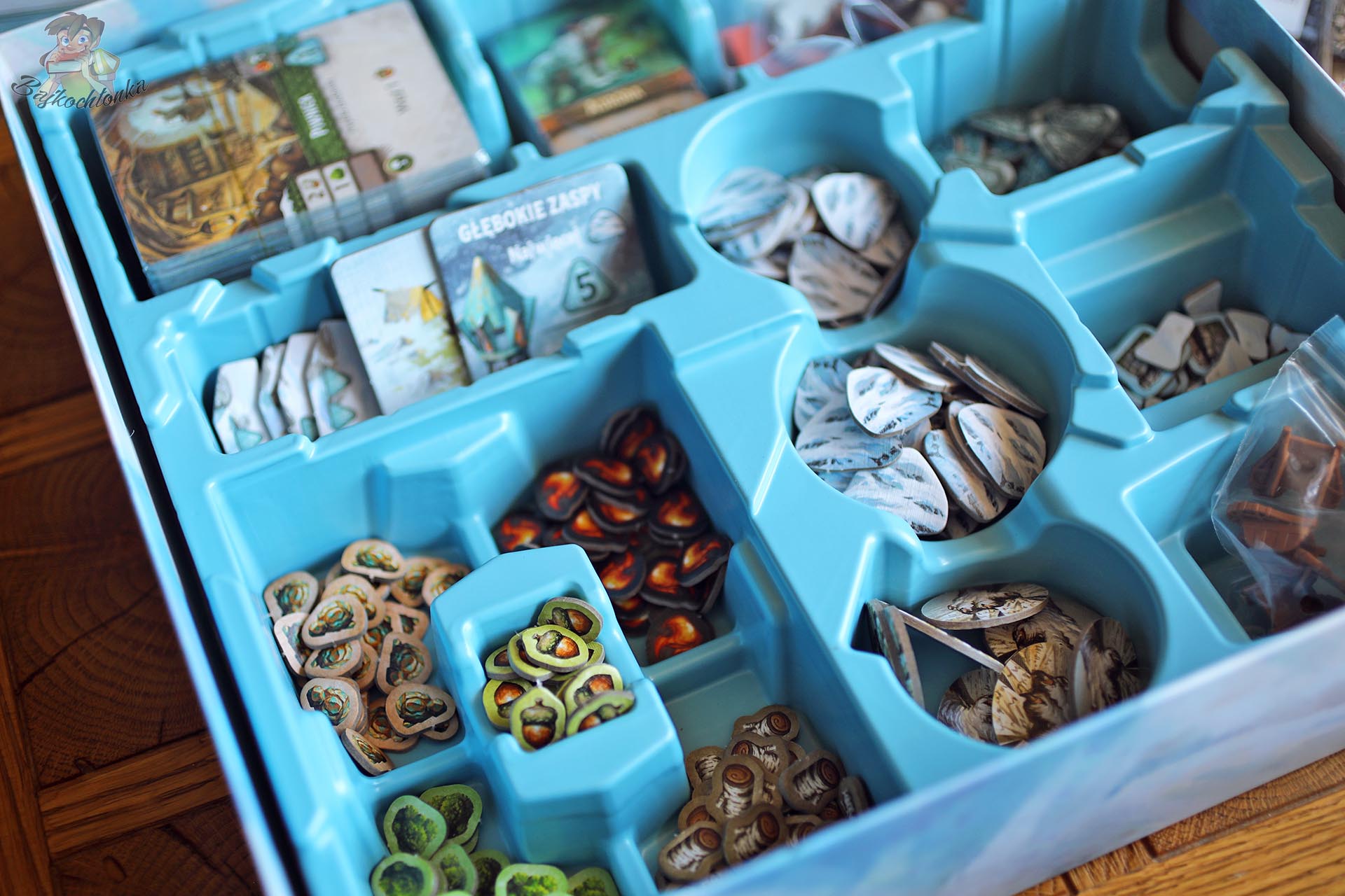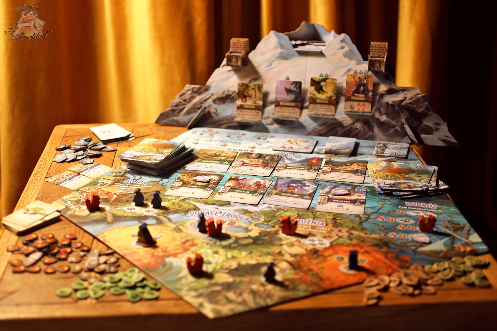 Planszówka składa się także na pięknie wydaną planszę z zaznaczoną Dolinką, Gildią (wprowadzającą również nowe mechaniki), miejscami do poboru zasobów oraz małą legendą z porami roku czy podpowiedziami. W pudełku znajdziecie także aż 123 karty talii, 27 kart dużych stworzeń, 28 kart nizinnych i 14 kart misji wyżynnych pozwalających gromadzić punkty oraz będących główną osią misji.