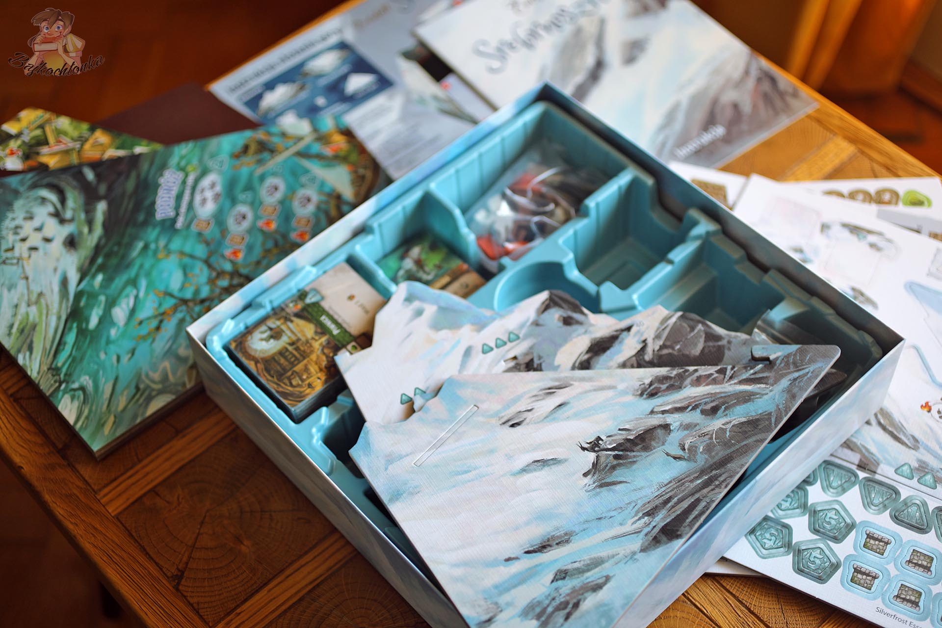Jeżeli graliście już wcześniej w Evedell, to pewnie brzmi to dla Was znajomo. Choć pozycja ma wiele wspólnych elementów, szybko jednak okaże się, że Srebrnoszrony nie jest tylko tą samą mechaniką osadzoną w nieco innej scenografii. To właśnie zimowy krajobraz staje się dla tej planszówki inspiracją – stwarza dla uczestników gry nowe wyzwania, ale też urozmaica wizualnie całą zabawę.